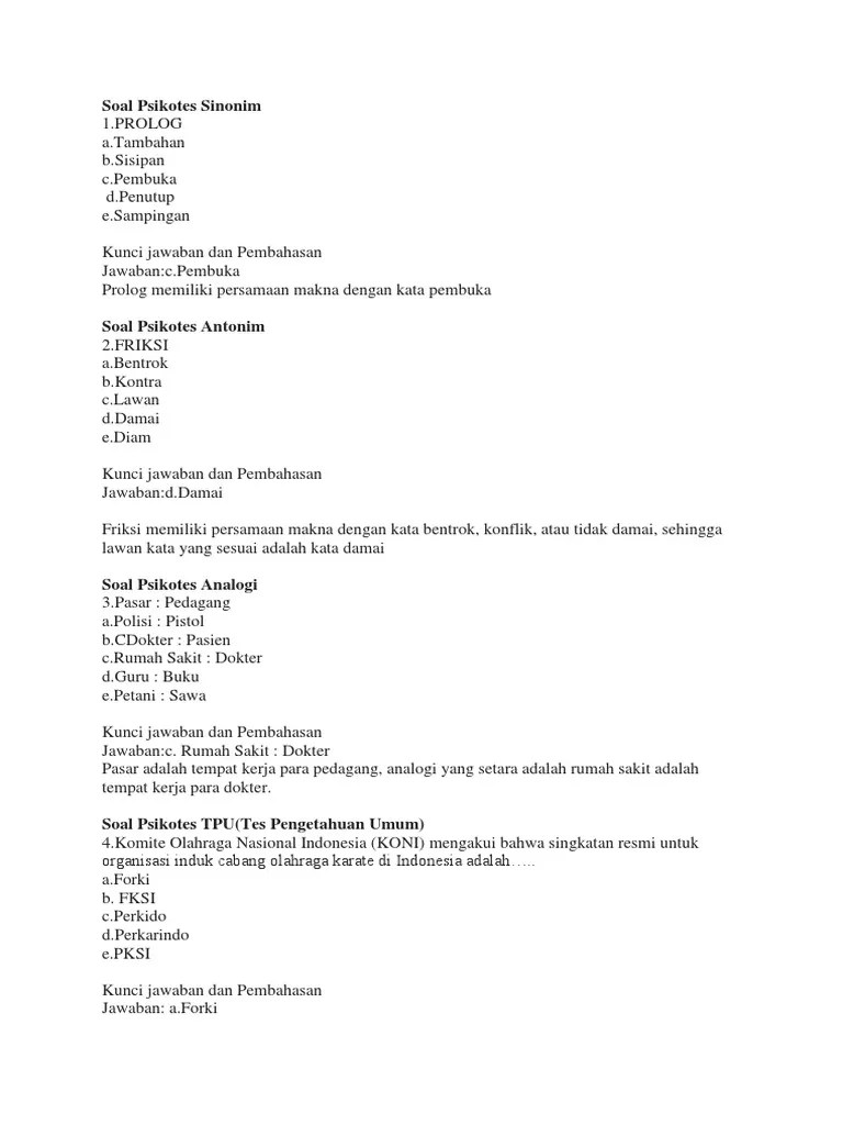 Contoh soal dan jawaban tes intelegensi umum (tiu) berikut adalah contoh soal beserta. Berapa jam yang ditempuh oleh sebuah kereta api dengan kecepatan 70 kilometer . Sinonim (persamaan kata) · 3. Contoh soal psikotes kemampuan verbal ini meliputi sinonim (persamaan kata),. Perbedaannya adalah pada tes ini menggunakan gambar 2 dimensi atau 3 dimensi.